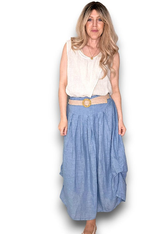 Helga May | Petrol Midi Raffia Belt Linen Skirt