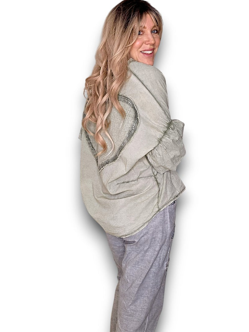 Description: A vintage wash, short sleeve cotton shirt with frill sleeves and heart applique to front and back.