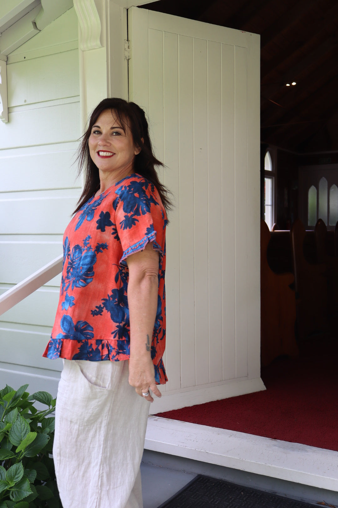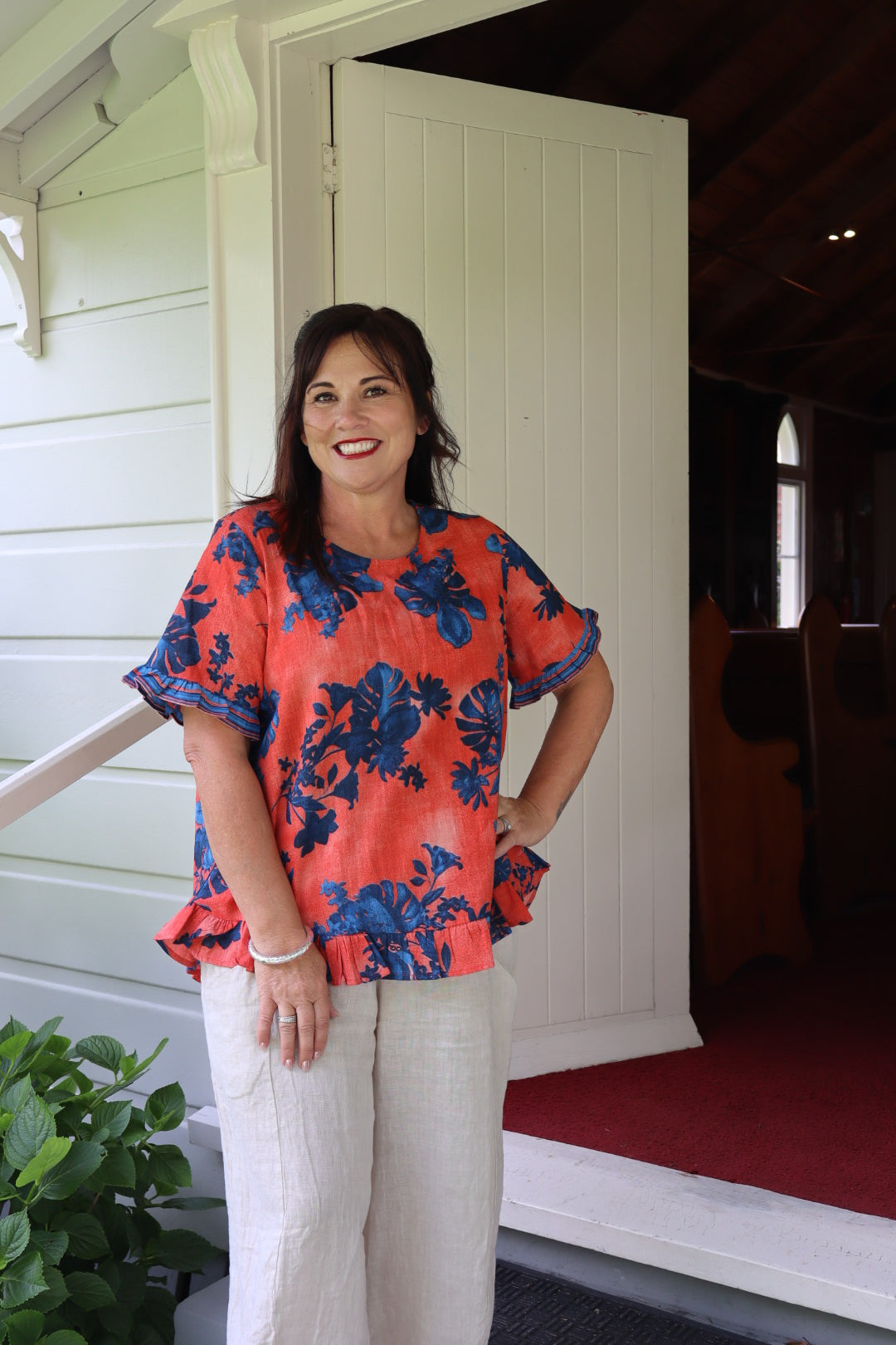 Perfect your summer style with our playful Arashi top. Featuring a relaxed fit, it showcases a gorgeous prints and colour. The playful ruffled sleeves and hem add a touch of whimsy, while the breathable fabric ensures all-day comfort. Perfectly paired with your favourite trousers or capris for a chic summer look.